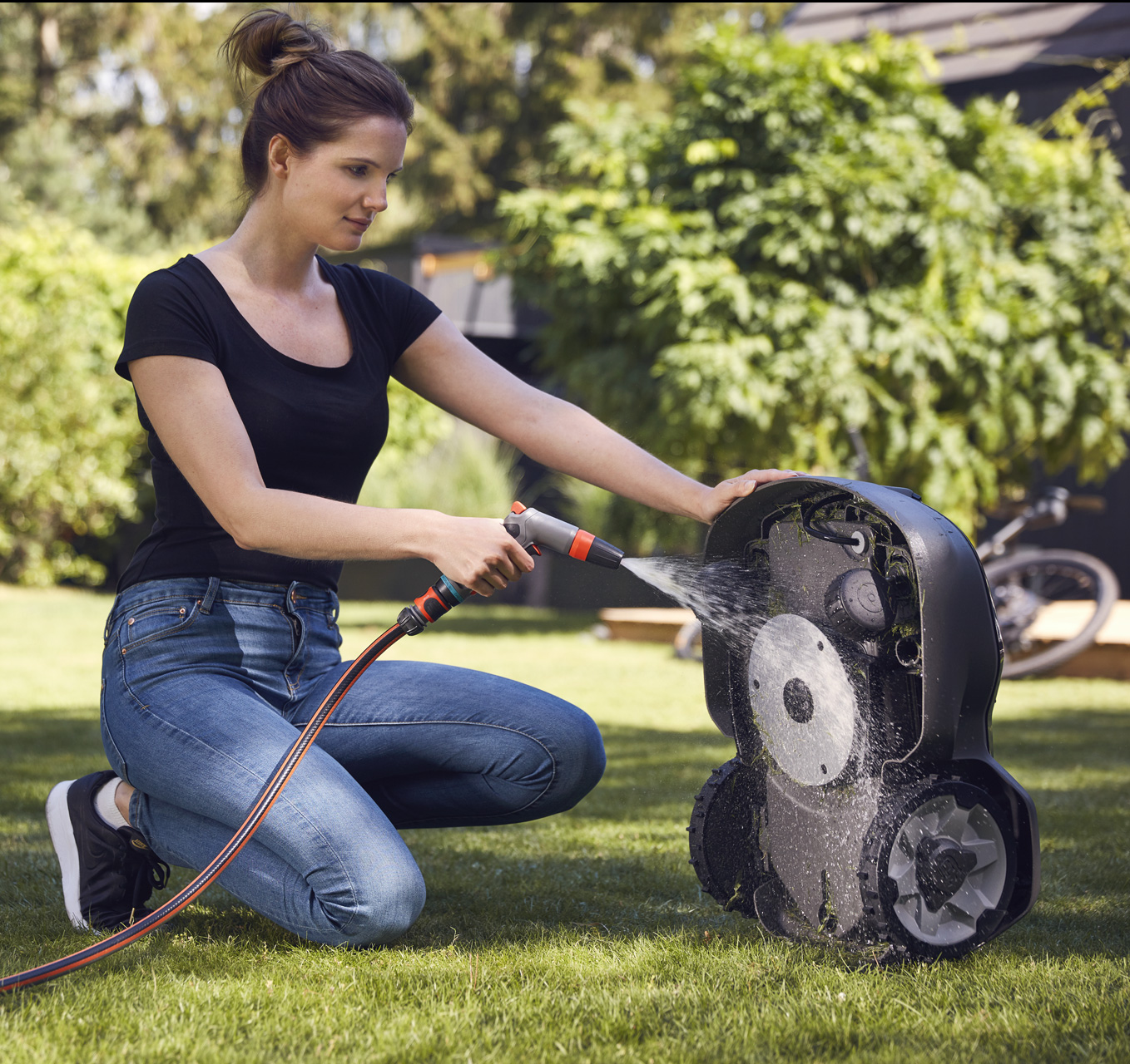 Sie können die Außen- und Unterseite des Mähroboters ganz einfach mit einem Gartenschlauch abspritzen. Abnehmbares Gehäuse für einfache Reinigung.